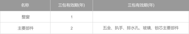 1、自产品安装完工后,1年内对整窗自身质量问题免费保修,主要部件(五金、执手、排水孔、玻璃、锁芯)保修期为2年,以工程竣工日为据。